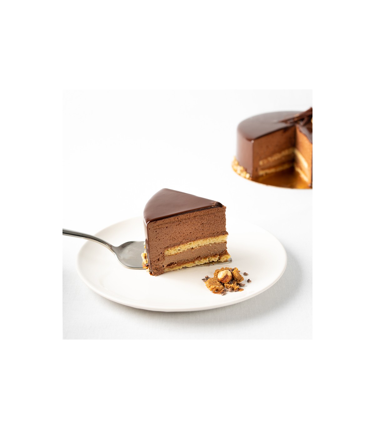 Biscuit moelleux, croustillant praliné, crémeux lacté, mousse chocolat noir, glaçage cacao.
