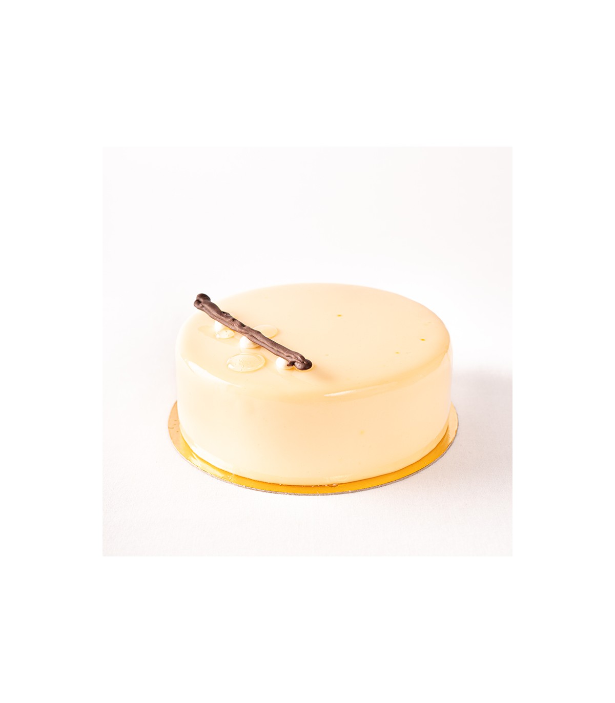 Biscuit moelleux, crémeux beurre salé, bavaroise vanille, glaçage.