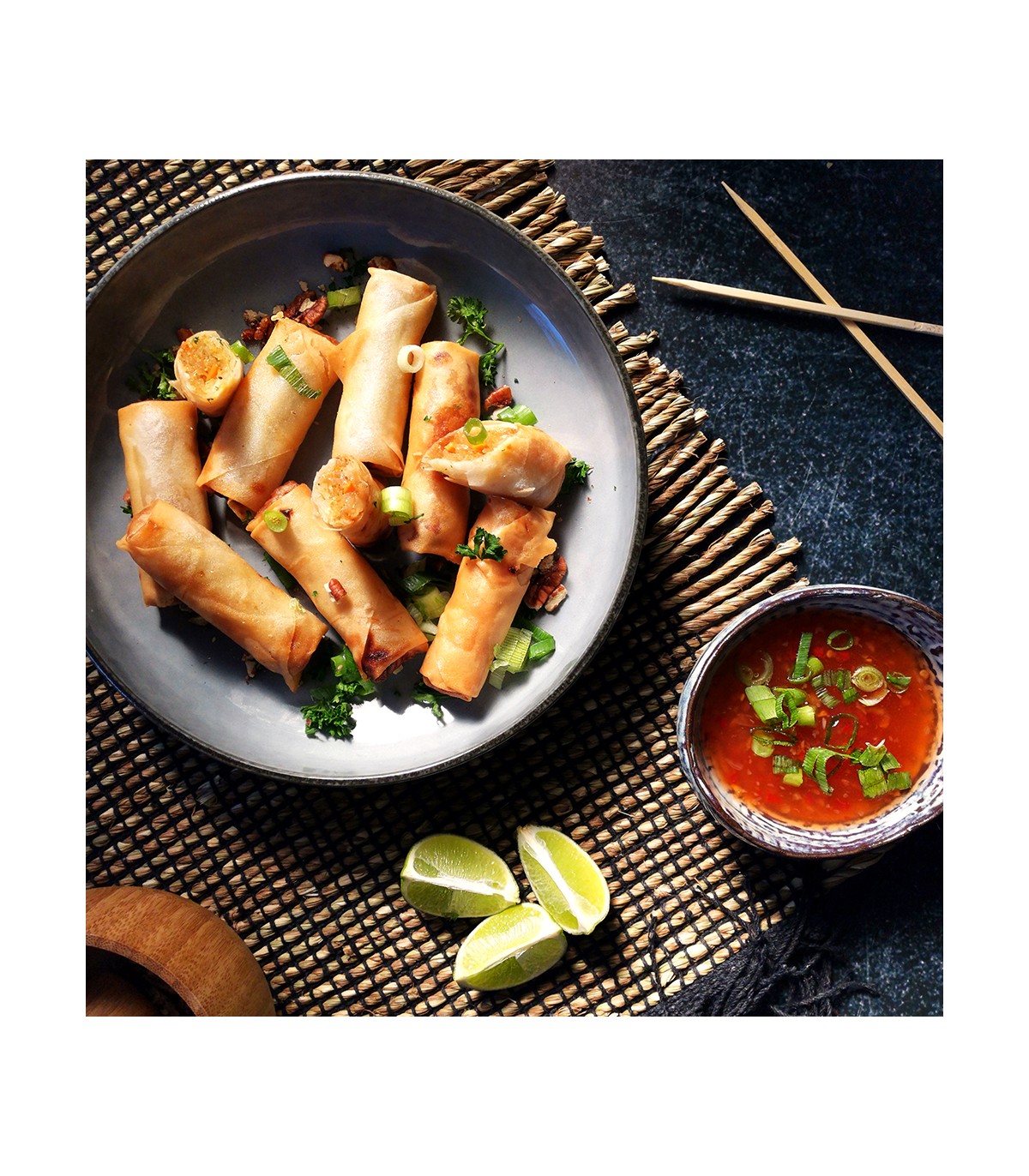 Vermicelles de riz et pousse de soja croquante, carottes et oignons, huile de sésame, enrobés dans une feuille de blé frit.