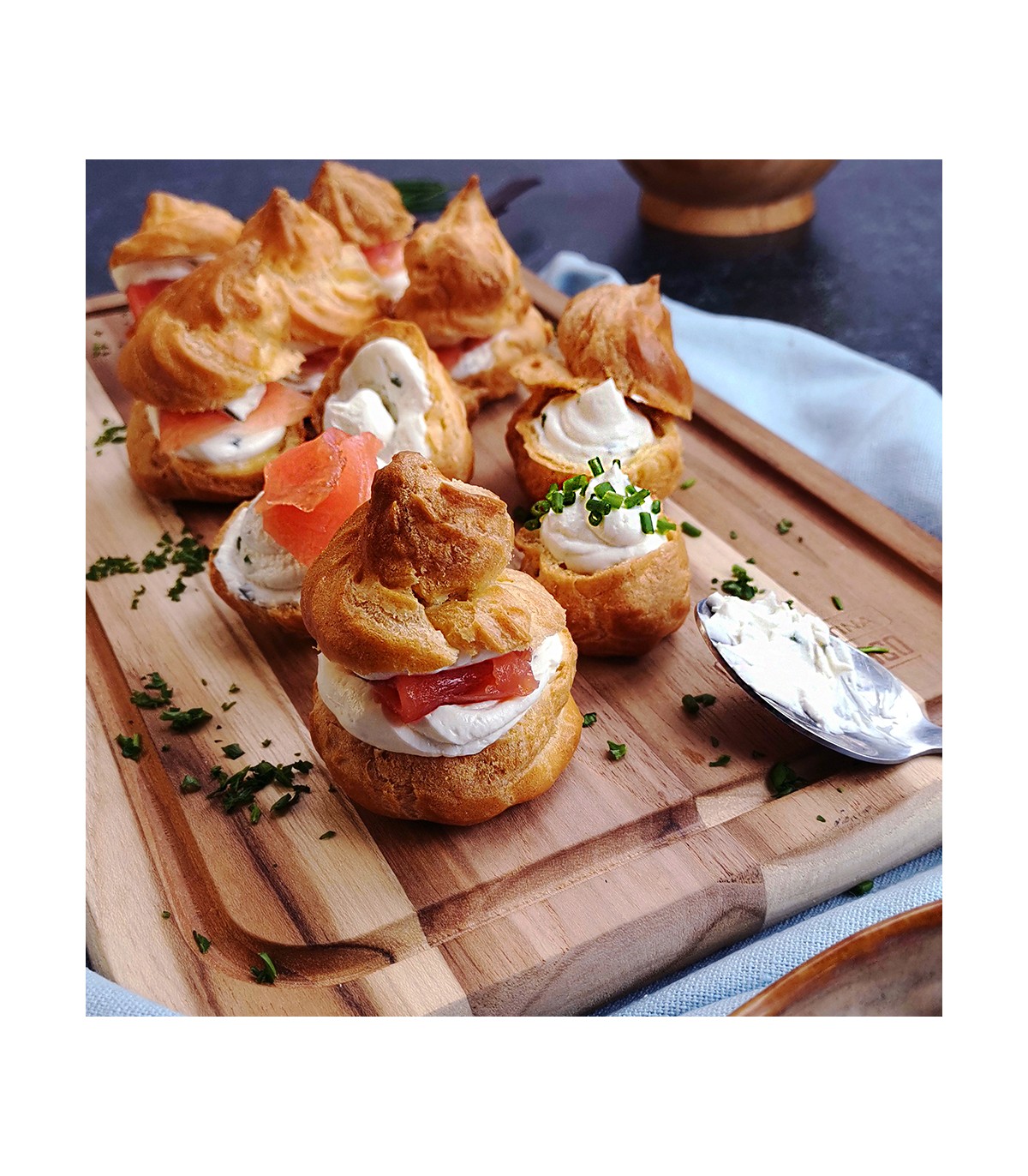 Chou au saumon fumé, farci d’une brousse à la ciboulette et au citron.
